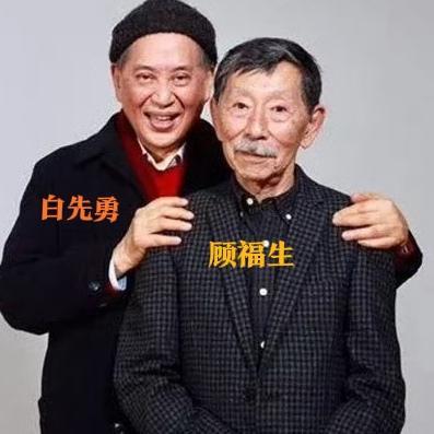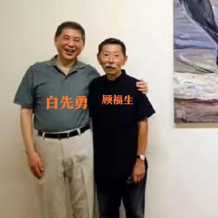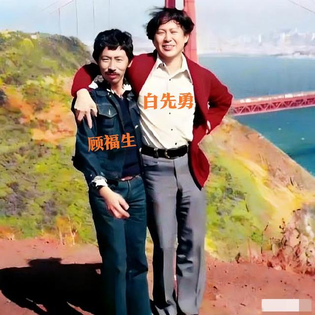 照片里的顾福生穿着一身牛仔工装,留着标志性的小胡子,神态沉稳又带着几分艺术家的不羁;身旁的白先勇则披着酒红色开衫,笑容爽朗,手臂自然搭在顾福生的肩头,两人紧紧依偎,全然不见父辈的政治隔阂,只留下知己间的亲密与默契。